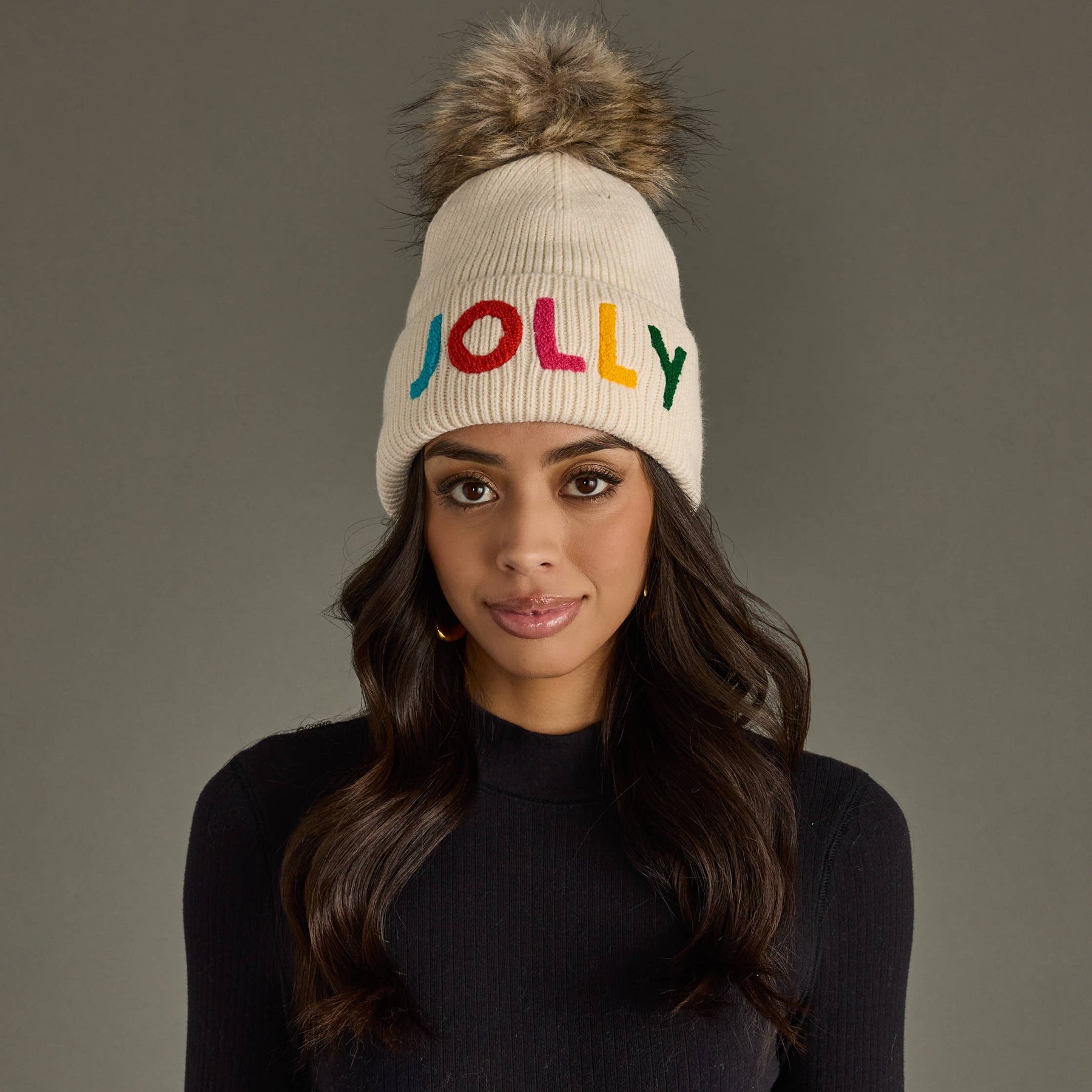 Beige knit beanie with colorful “JOLLY” embroidery and a faux fur pom. Fleece-lined for cozy comfort.