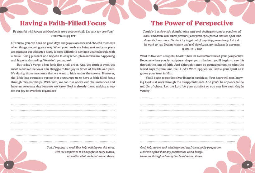 Make Today Your Very Best Day with These 180 Inspiring Devotions! Good days have many things in common: joy, blessings, wonder, delight, contentment. . .but the very best days are those that include God in the details. Your Best Day Devotional Journal provides much-needed encouragement and inspiration for your soul. With each turn of the page, you will encounter a lovely design alongside faith-building, biblically based devotions and related scripture selections. Touching on topics like stress, joy, emotions, rest, relationships, freedom, and more, these 180 readings will help you discover that your very best day always begins—and ends—in conversation with your heavenly Father.