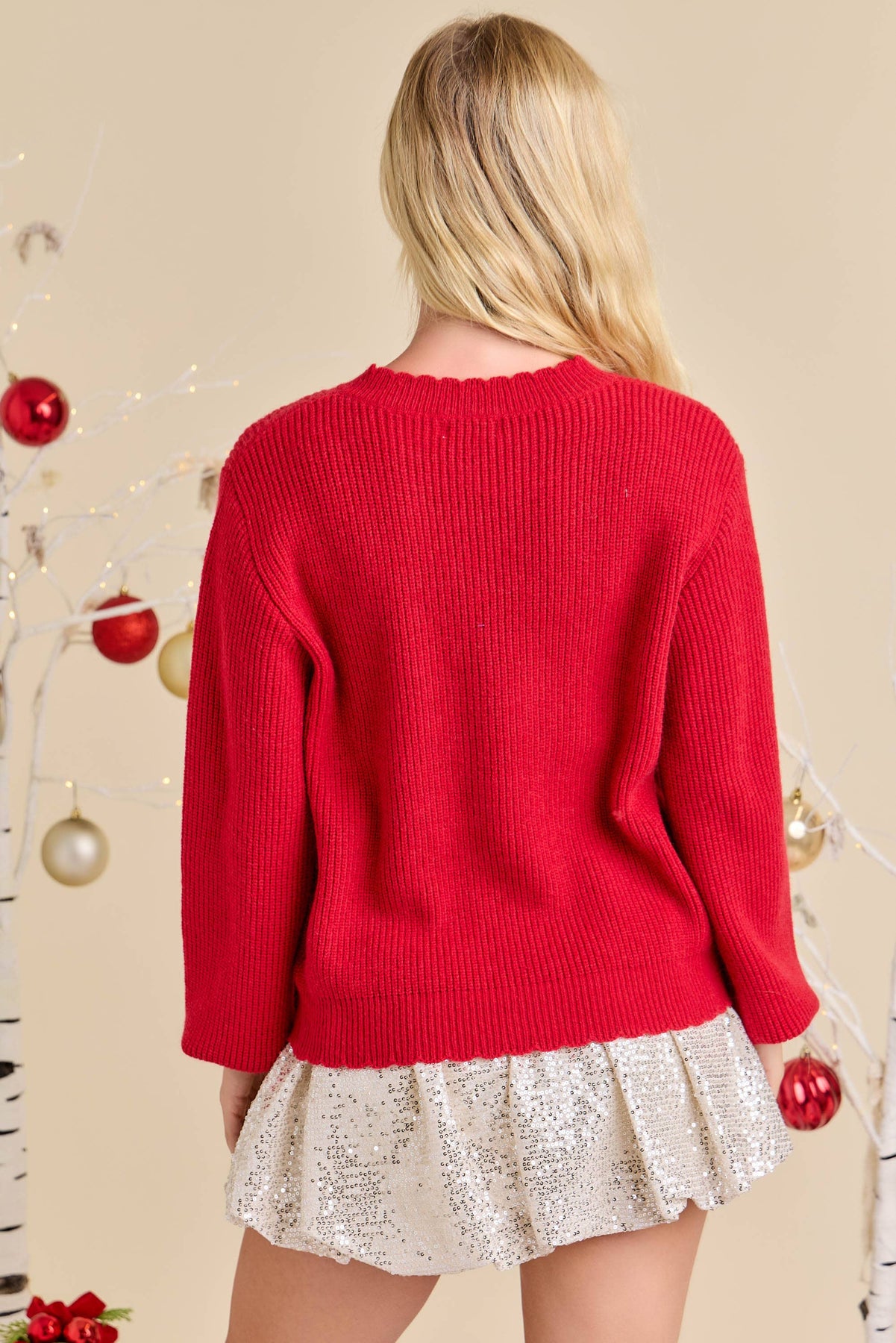Add a touch of elegance to your holiday wardrobe with our Pearl Bow Knit Cardigan. This soft red knit features delicate pearl-accented bows and scalloped edges for a sweet, feminine finish. Perfect for layering over dresses or pairing with denim for a festive yet timeless look. ❤️✨
