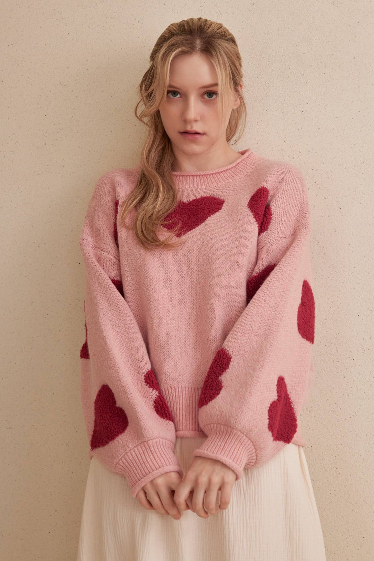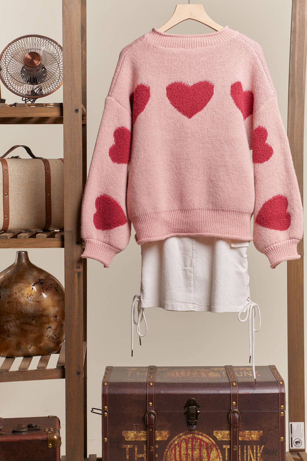 Fall in love with the details — this soft pink pullover features plush red heart patches and an easy, relaxed fit that feels as sweet as it looks. Perfect for chilly days, cozy mornings, and all the moments that call for a little extra love.