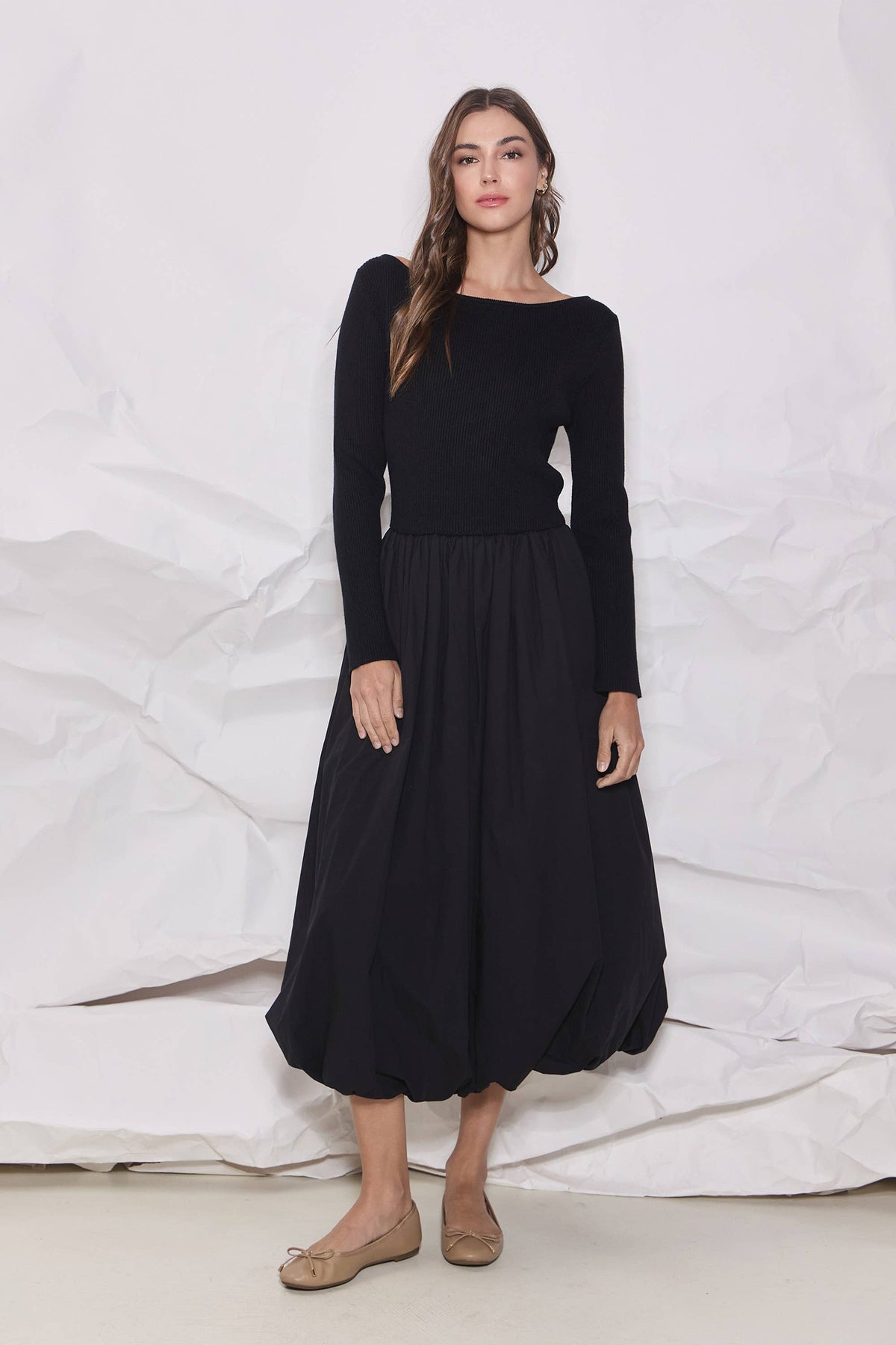 Sleek, sculptural, and effortlessly modern — The Atelier Dress is where artistry meets simplicity. Featuring a soft knit bodice with a dramatic bubble hem skirt, it creates a refined silhouette that moves with quiet confidence. Perfect for dinners, events, or any day you want to look polished with ease.