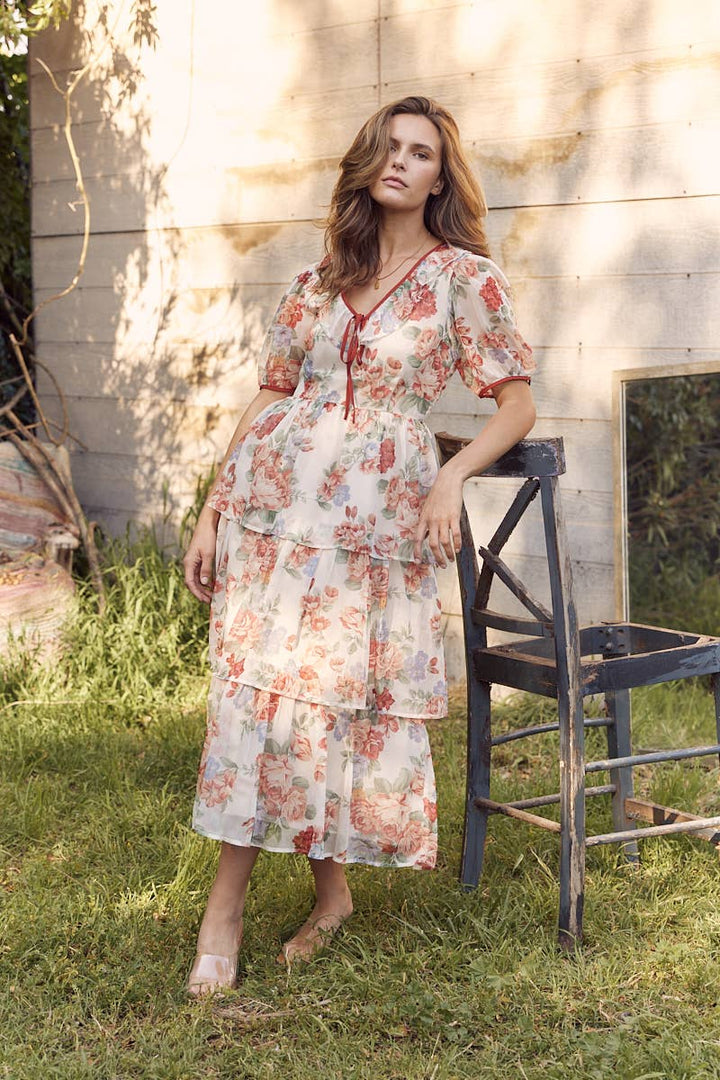 This stylish midi dress exudes feminine and romantic vibes with its Victorian-inspired floral print fabric, tiered silhouette, and contrasting binding detail for added dimension. It is designed to fit beautifully on a variety of sizes, as demonstrated by our 5'8" model wearing a size small.